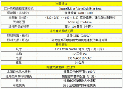 PV-LIT太陽能電池和組件在線檢測系統(tǒng)可對太陽能電池及完整的太陽能組件的各種缺陷進(jìn)行全自動(dòng)檢測。PV-LIT可以在線非接觸快速穩(wěn)定的連續(xù)檢測生產(chǎn)過程中的產(chǎn)品,檢測時(shí)間小于1秒鐘。另外,客戶也可選擇接觸系統(tǒng)(DLIT)進(jìn)行單個(gè)抽檢及詳細(xì)實(shí)驗(yàn)。