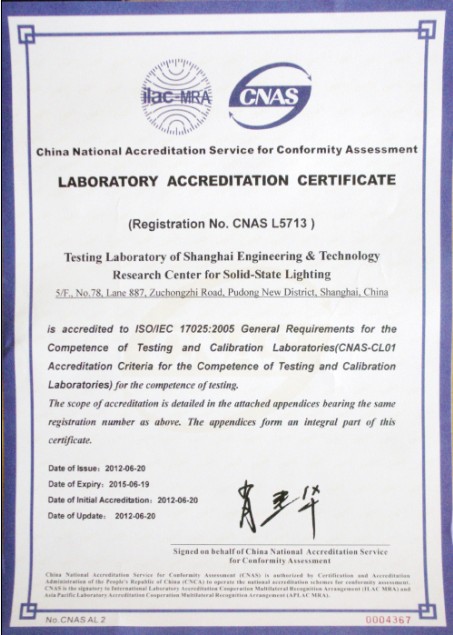上海半導(dǎo)體照明工程技術(shù)研究中心檢測實(shí)驗(yàn)室於2012年5月22日獲得中國計(jì)量認(rèn)證CMA資質(zhì);於2012年6月20日正式獲中國合格評定國家認(rèn)可委員會(huì)(CNAS)檢測實(shí)驗(yàn)室能力認(rèn)證(注冊編號(hào):L5713)。