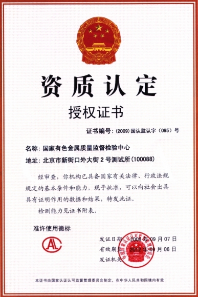 國(guó)家級(jí)資質(zhì)認(rèn)定授權(quán)證書(shū),CAL(2009)國(guó)認(rèn)監(jiān)認(rèn)字(095)號(hào);