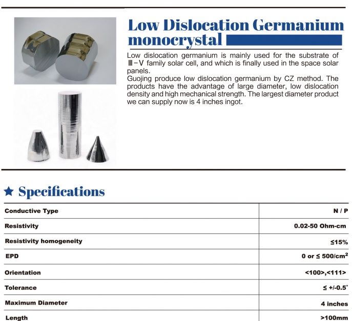 We invented 4’’ & 6’’ VGF monocrystal furnace with independent intellectual property right, and set up a production line of 4’’ & 6’’ zero EPD VGF germanium wafer producing line.
